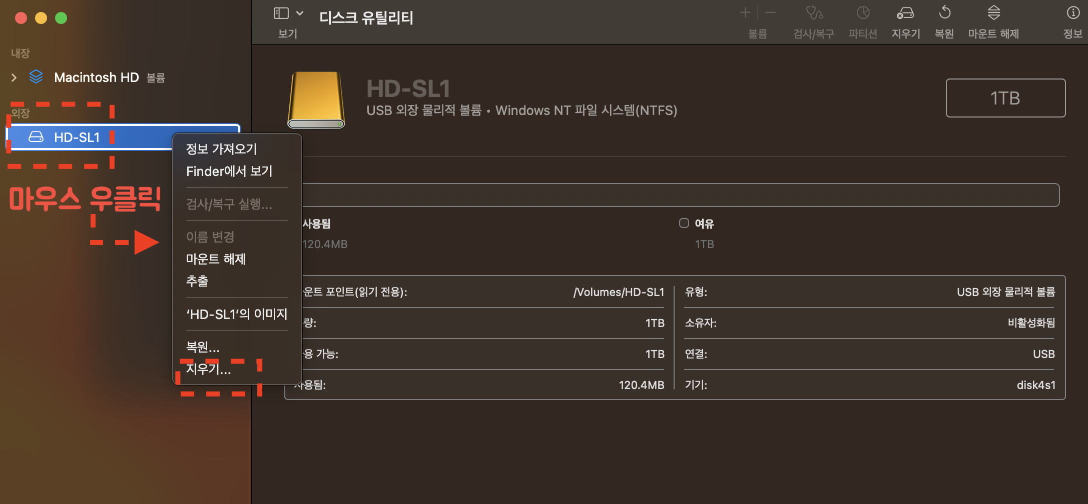 결국 제가 알아낸 것은 하드디스크의 포맷 형태가 윈도우 기반으로 되어있어서 이것을 맥에서 호환가능한 형태로 변환하기 위해 새로이 포맷을 해야 한다는 것이었죠. 다행히 새로 산 외장하드라 저장된 데이터가 별로 없어서 바로 포맷을 진행하였습니다.