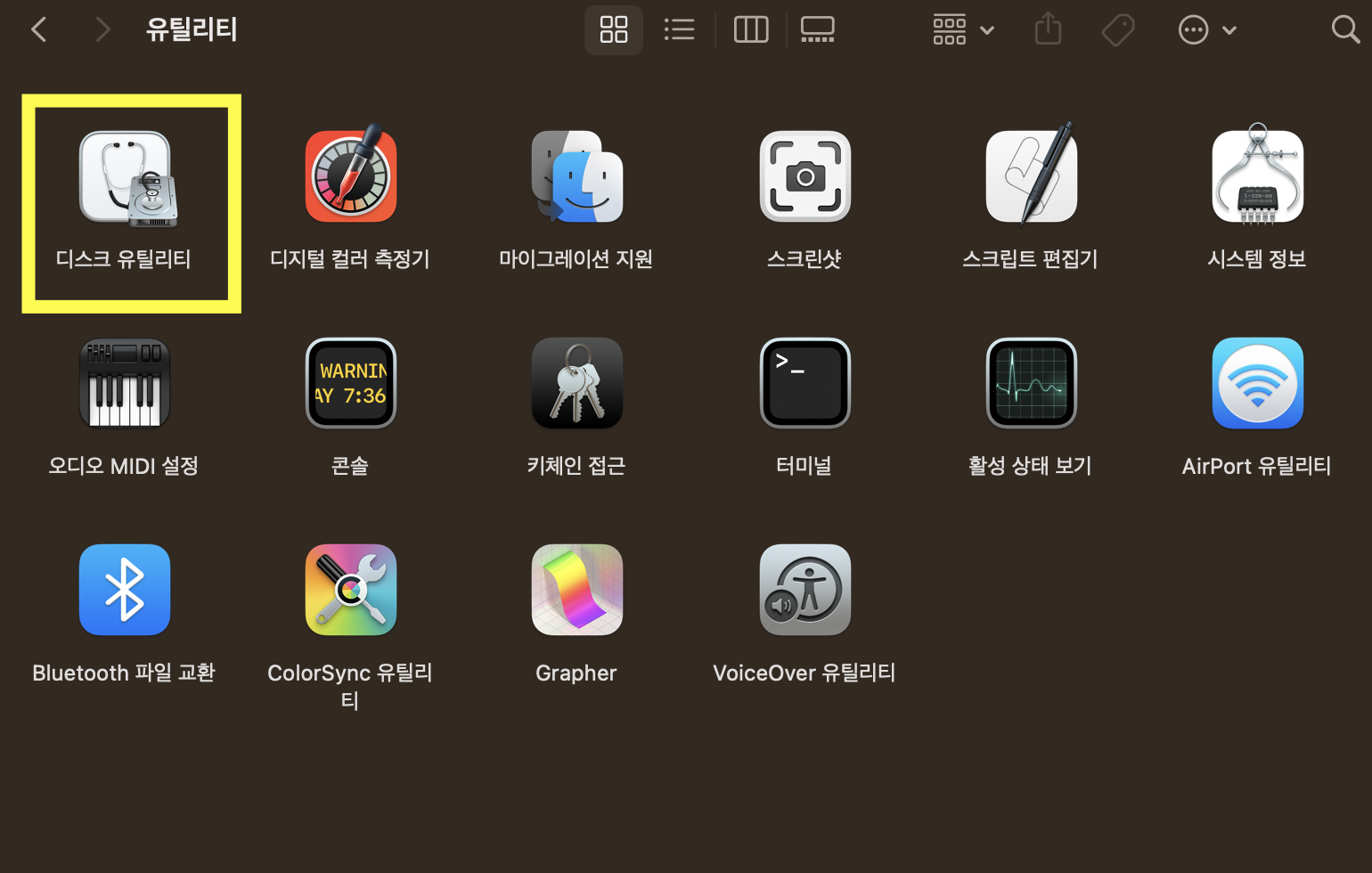 유틸리티 프로그램을 누르면 그 하위 메뉴로 [디스크 유틸리티]가 나타나는 데요. 이것이 바로 맥에 있는 내장하드와 주변장치인 외장하드 디스크를 관리하는 유틸리티입니다. 아래 화면의 노란색 박스에 있는 [디스크 유틸리티]를 눌러줍니다.