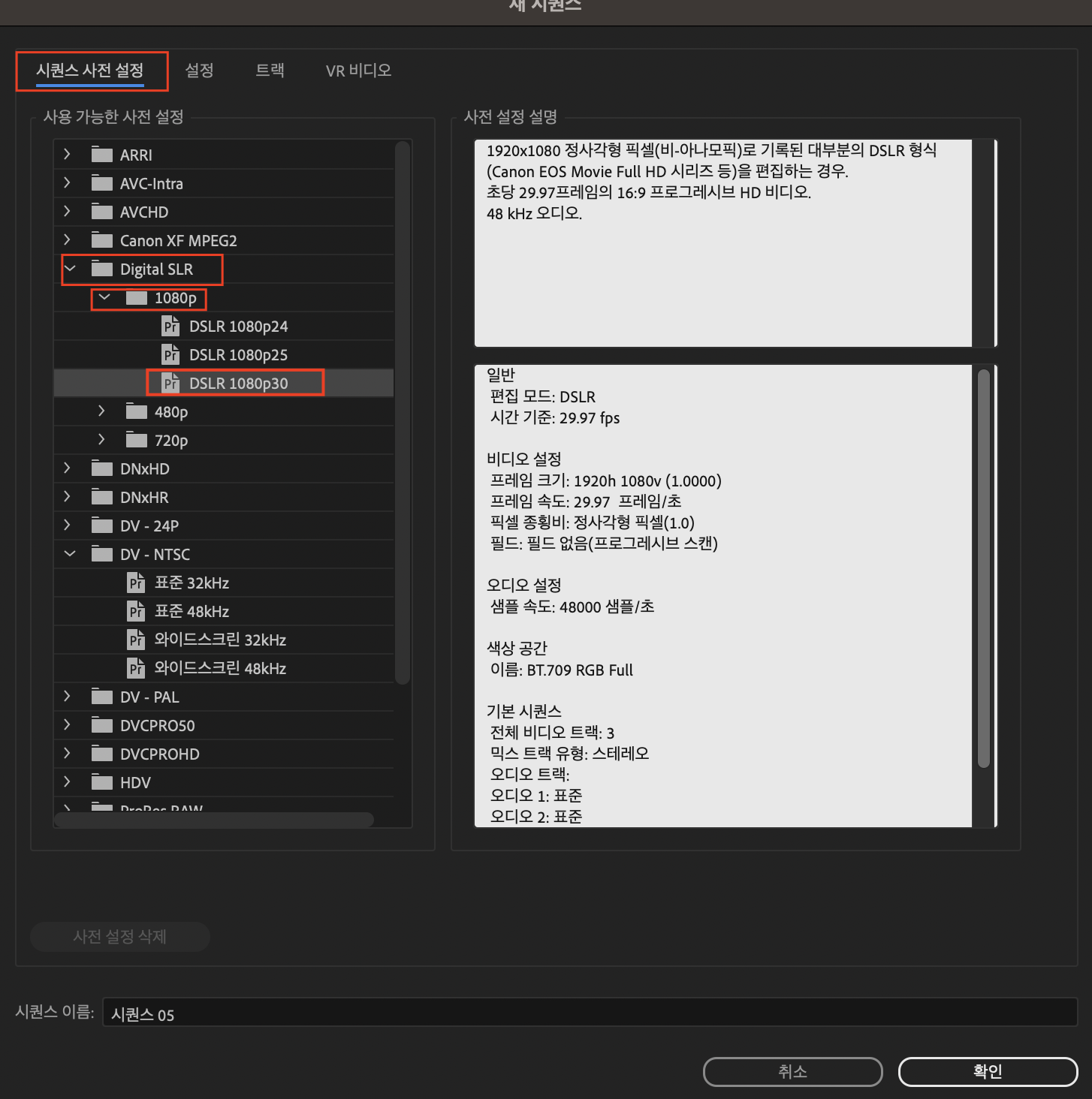 그럼 아래와 같은 화면이 나오는데요. 여기서 [시퀀스 사전 설정] 을 먼저 설정해 보도록 하겠습니다. [시퀀스 사전 설정]은 이후에 시퀀스를 기존의 설정과 동일하고 반복적인 형태로 만들게 된다면, 미리 형식을 저장해 두고 꺼내 쓰기 편리하게 프리셋을 만들어두는 것이라고 이해하시면 됩니다. DSLR 1080p30이라는 뜻은 프레임속도가 29.97 프레임/초를 의미합니다. 아래 붉은색 박스를 친 메뉴대로 입력을 하고 나서, 밑에 있는 확인 버튼을 누르지 말고, 바로 옆에 [설정]을 클릭합니다.