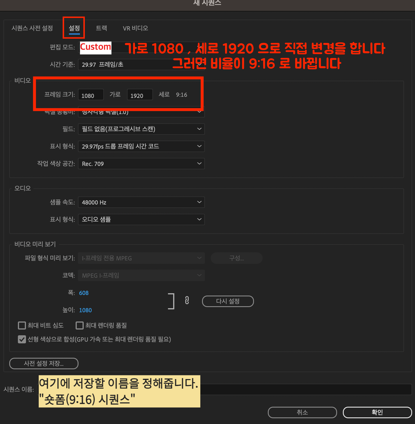[설정]으로 넘어오면 프레임 크기 부분에 1080, 1920으로 바꿔서 입력을 해줍니다. 그러면 옆에 비율이 저절로 9:16으로 바뀌는 것을 보실 수 있을 거예요. (붉은색 박스 영역 참고) 편집모드는 custom으로 바꿉니다. [시퀀스 이름]을 지정하고 난 뒤에 확인 버튼을 누릅니다. 시퀀스 이름을 지정해 놓으면 향후에 동일한 사이즈의 시퀀스를 만들 때, 미리 만들어 준 시퀀스를 불러올 수가 있거든요. 그래서 머리가 나쁜 저를 위해서 알아보기 편하도록 시퀀스 이름을 "숏폼(9:16) 시퀀스"라고 붙여보았습니다.