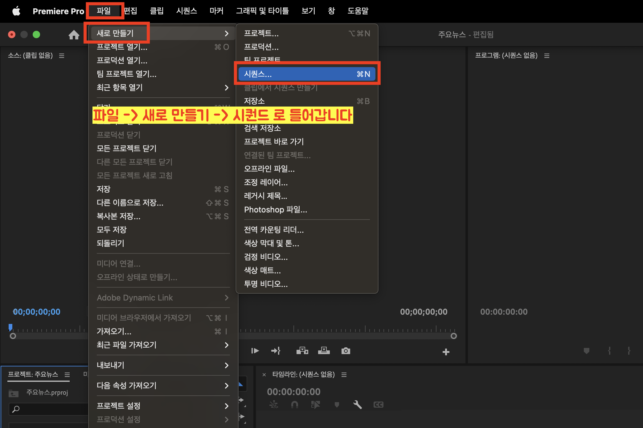 상단 메뉴에 보면 [파일] - [새로만들기] - [시퀀스]를 눌러 들어갑니다.
