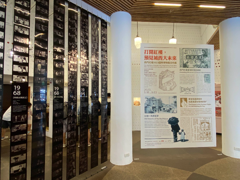 그럼 시먼홍러우 내부로 들어가 보았습니다. 고풍스럽고 세련된 분위기의 공간이 나타났습니다. 한쪽 벽면에는 이 건물을 소개하는 자료로 채워져 있었습니다. 뜻밖의 공간을 만나니 시간을 초월하여 시간여행을 한 것 같은 기분이 들었습니다. 천장에는 예쁜 조명으로 빛나며 반질반질한 바닥을 환히 비추었지요. 원형 기둥이 팔각괘의 모서리를 받치고 있었지요. 바깥 날씨가 참 무덥기도 했거니와 건물 내부의 아름다운 모습을 접하니 밖에 나가기가 싫더라고요. 한동안 이곳에서 시간을 보내며, 극장으로 이용되던 당시 여배우가 곡선으로 이어진 계단을 내려오며 무대를 꾸미는 모습을 상상해 보았습니다.