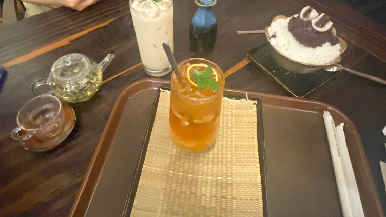 식사를 끝나고 나면 이제 디저트를 먹어야죠. 인사동 쌈지길이 위치한 메인도로는 너무 복잡했어요. 메인도로 옆으로 길게 뻗어있는 골목길로 향했습니다. 골목길은 예스럽고 고즈넉한 분위기와 독특한 감성이 스며있는 곳이었어요. 달빛과 잘 어울린다는 생각이 들었었지요. 한옥찻집이라는 곳에 가서 밭빙수, 연잎차, 코코넛젤리가 들어간 음료 (이름 까먹음), 밀크티를 주문했습니다.