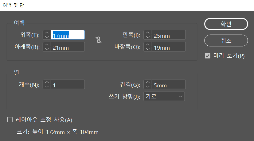 여백 : 이건 사실 레이아웃에 따라 다르긴 한데요. 저는 위를 좁게, 아래를 넓게, 안쪽을 넓게, 바깥쪽을 좁게 설정을 했습니다. 위쪽 17mm , 아래쪽 21mm , 안쪽 25mm , 바깥쪽 19mm로 제가 마음에 드는 대로 정했습니다.